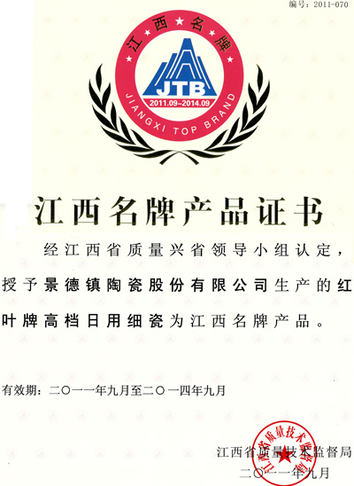 2011年10月9日在南昌召開了2011年江西名牌產(chǎn)品及質(zhì)量管理先進企業(yè)授牌大會,“紅葉”陶瓷榮獲2011年江西名牌產(chǎn)品稱號。