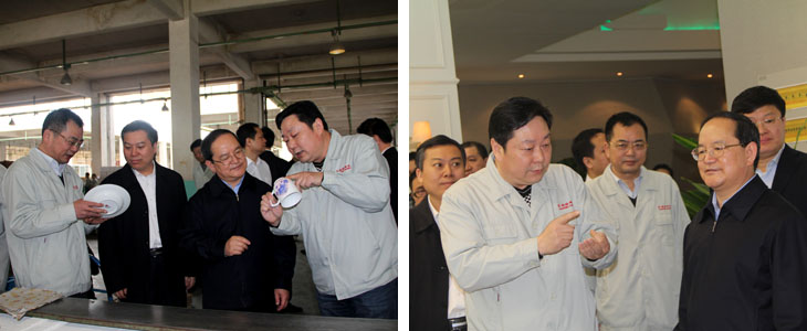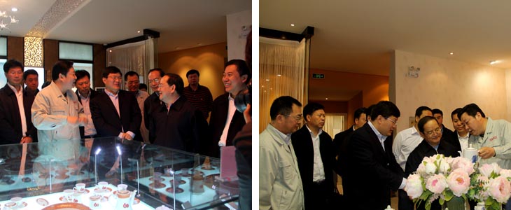 2012年4月6日江西省人民政府省長鹿心社一行在市委書記鄧保生、市長劉昌林等省市領(lǐng)導的陪同下來我司視察工作,鹿心社省長一行參觀了工廠生產(chǎn)車間、國瓷館,詳細了解了公司的生產(chǎn)運營情 況并對公司產(chǎn)品贊不絕口。視察期間,鹿心社省長對公司給予了高度評價:“你們公司為景德鎮(zhèn)爭了光,為江西爭了光,為國家爭了光。"并希望公司能牢牢抓住精品路線,抓住高端市場,搞活機制,繼續(xù)做的更大更好。