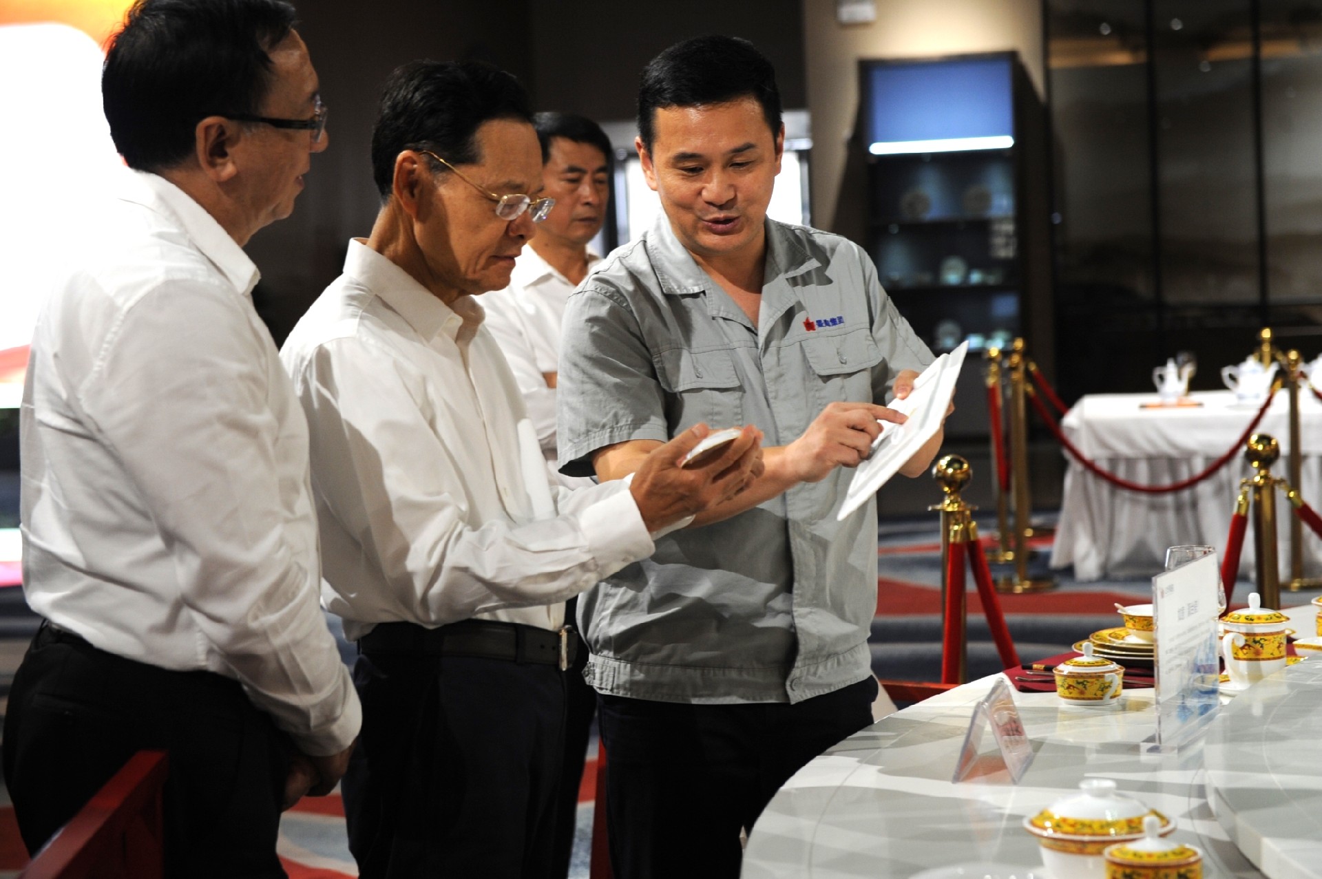 在國瓷館展廳,鄧景揚(yáng)向陳武介紹了紅葉陶瓷產(chǎn)品特色和先進(jìn)制瓷工藝,重點(diǎn)講述了一系列“國瓷”“國禮”故事。陳武對(duì)精美的產(chǎn)品給予高度評(píng)價(jià)。